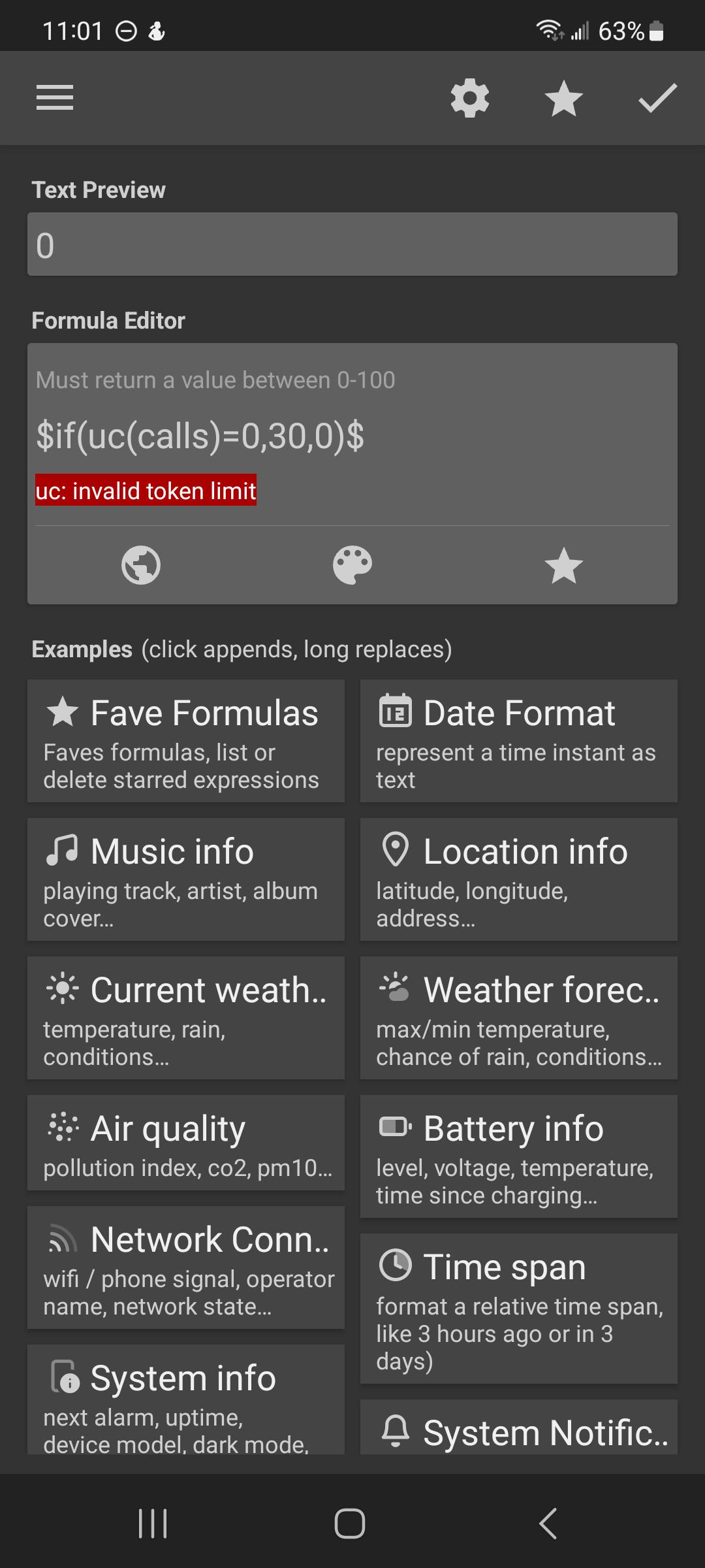 Recently my Kustom phone widget stopped working. First it changed from a 1x1 to a 2x1 widget by itself. Then the formulas within show an error of “uc: invalid token limit”. As best I can tell, there have been no recent updates to the device, phone app or KWGT app anytime near when the problem started.