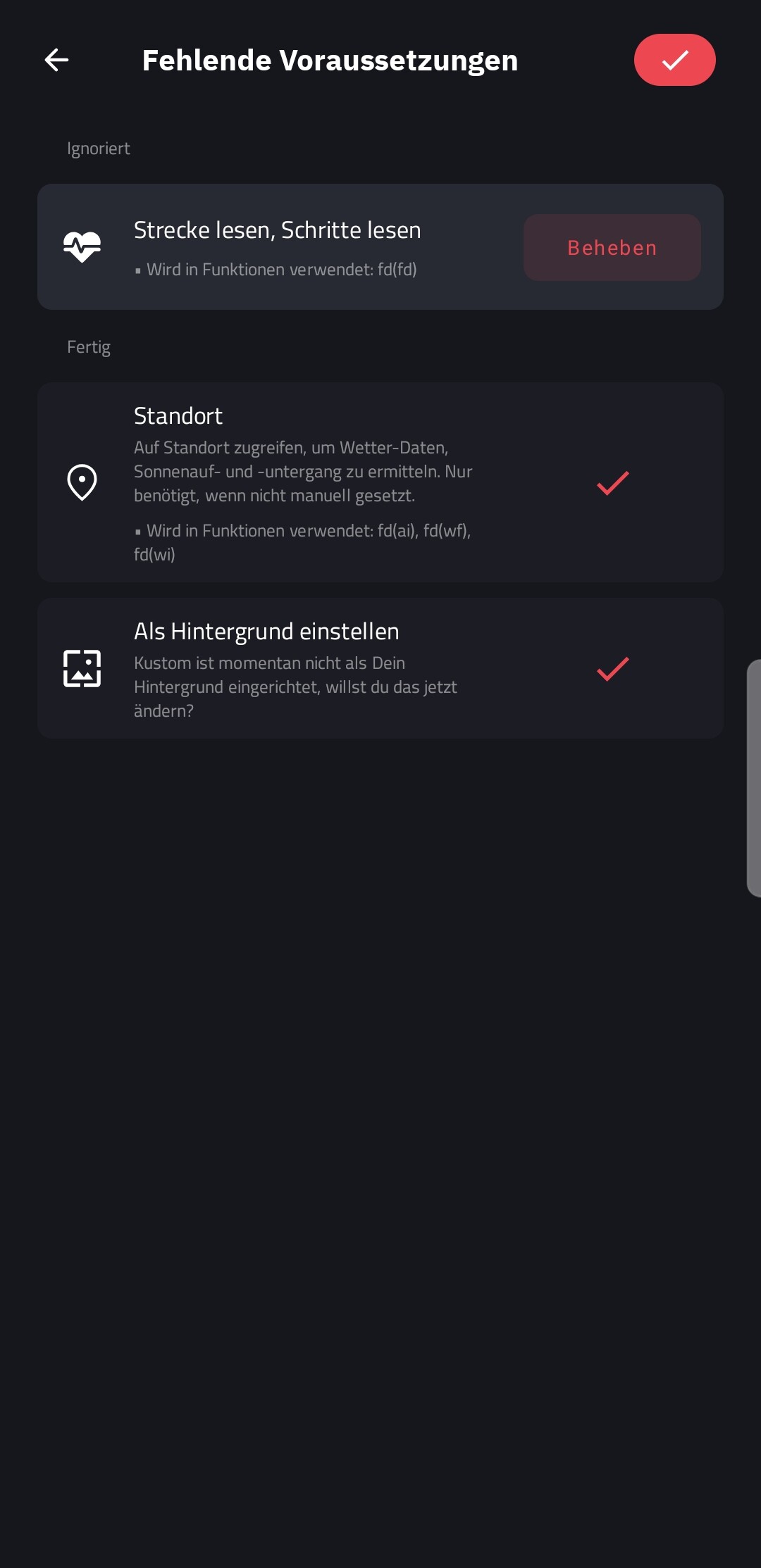 $fd(steps)$, $fd(cals)$, etc., will stop working as the permissions are gone.I’m sorry for the frustration this causes. I did everything I could to make this work, but the current Play Store policies make it impossible for a customization tool to access this data.