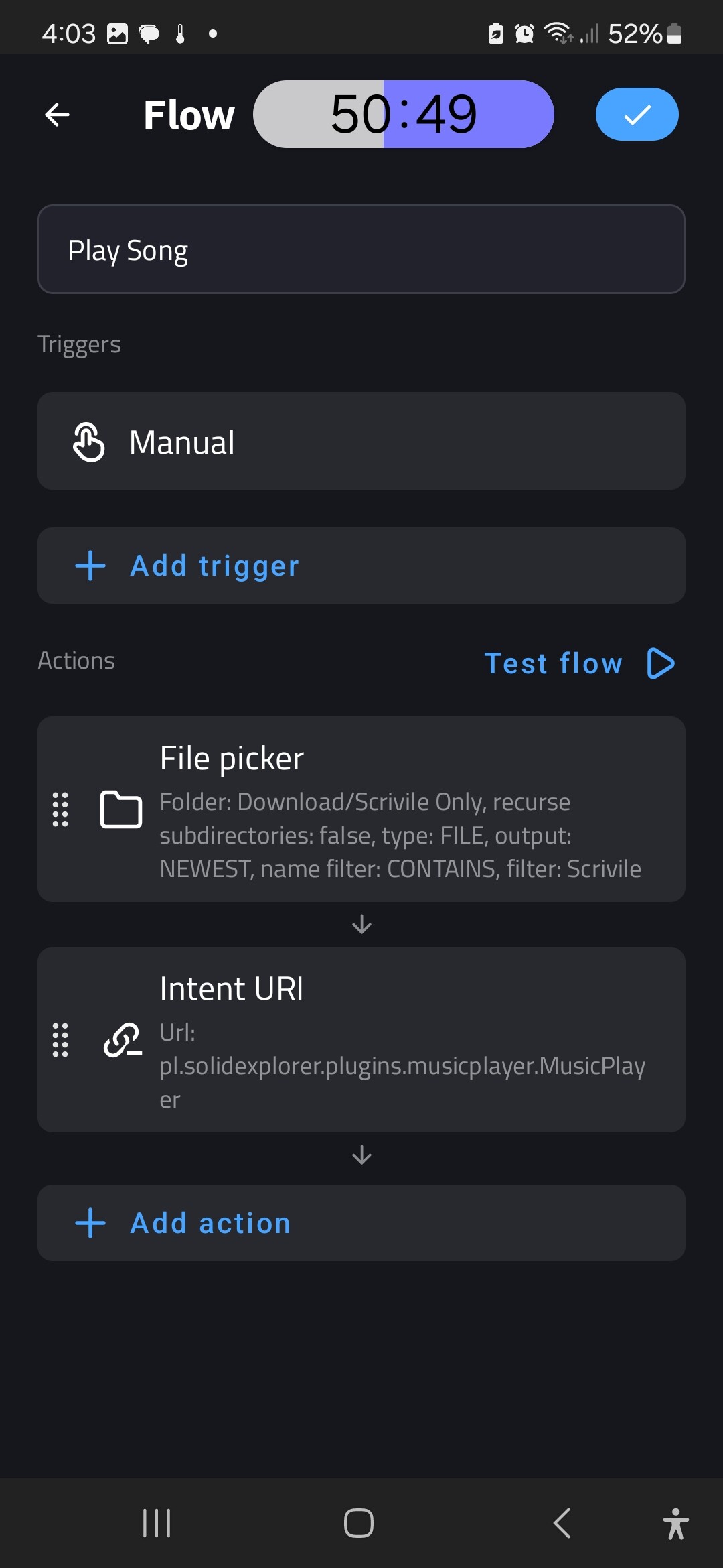 In order to be able to trigger an audio playback programmatically, IMO you need a 3rd party app like Tasker or Automate so that you can set up a Flow for sending a “play” command to the Tasker or the Automate.