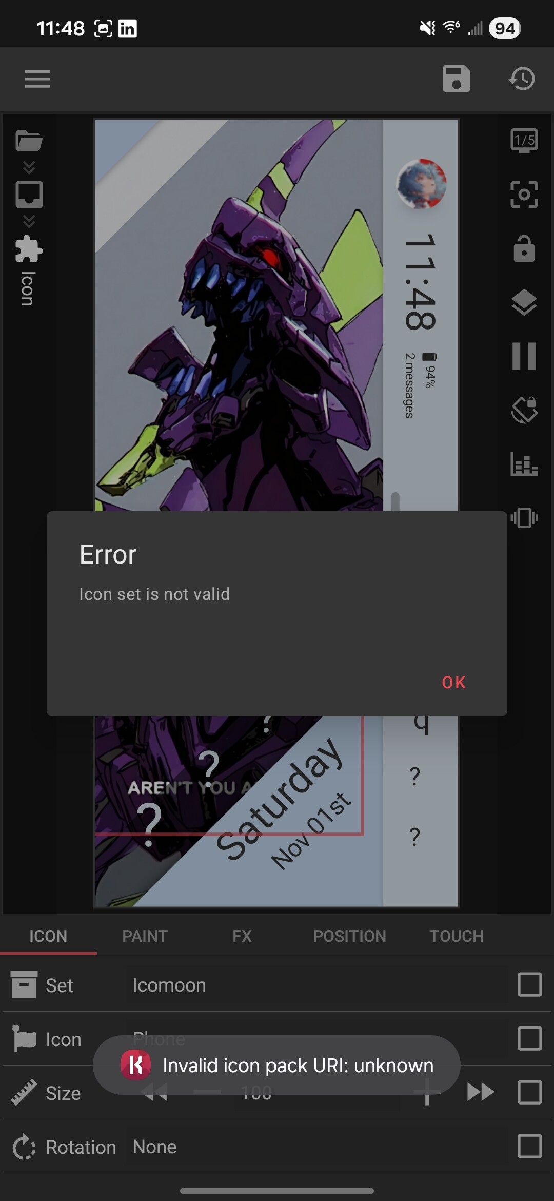 The latest version of KLWP (v3.81) broke every icon on the wallpaper I’m using, which is the Edge Ui wallpaper. It looks like the wallpaper packs that were used by the wallpaper were removed in the latest update, causing invalid icons that show up as a question mark or the letter q.