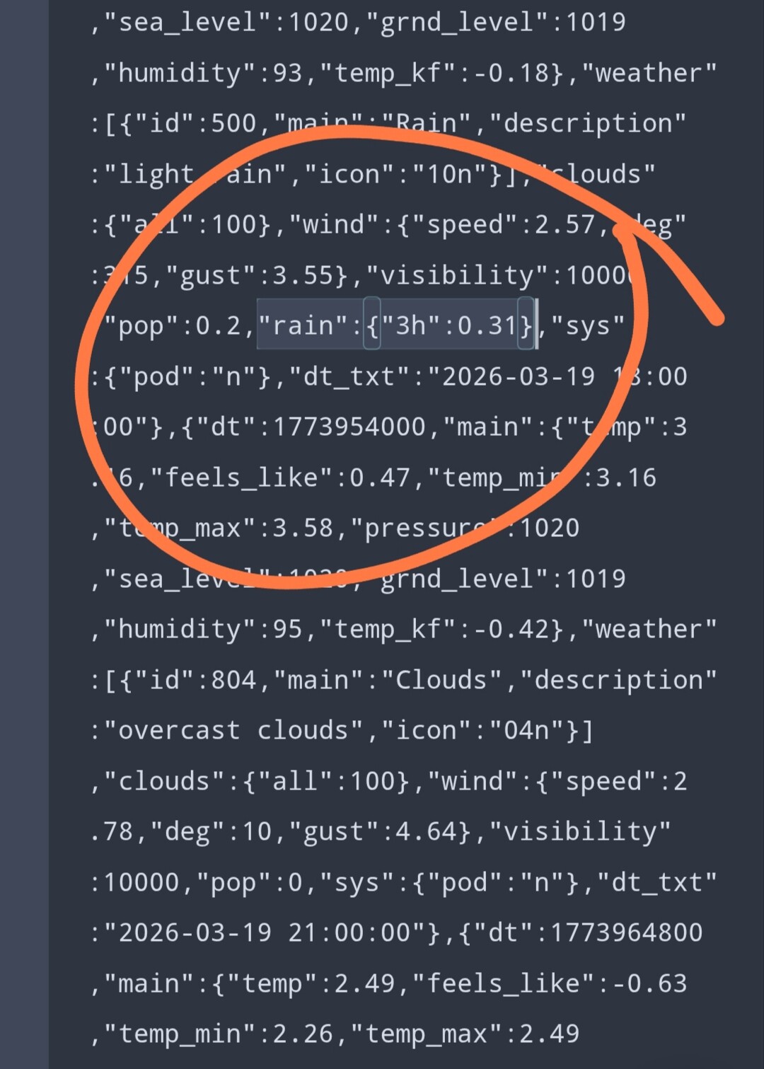 In the API response from the provider, there is a specific field for precipitation, for example: “rain”: {“3h”: 0.31}.