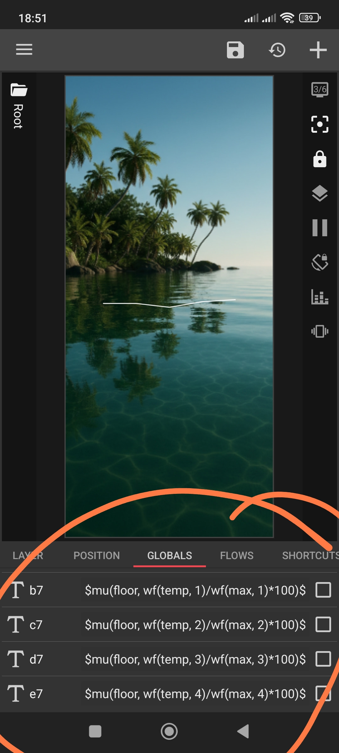 M75 $mu(floor, wf(temp, 3)/wf(max, 0)*100)$ L100 $mu(floor, wf(temp, 4)/wf(max, 0)*100)$