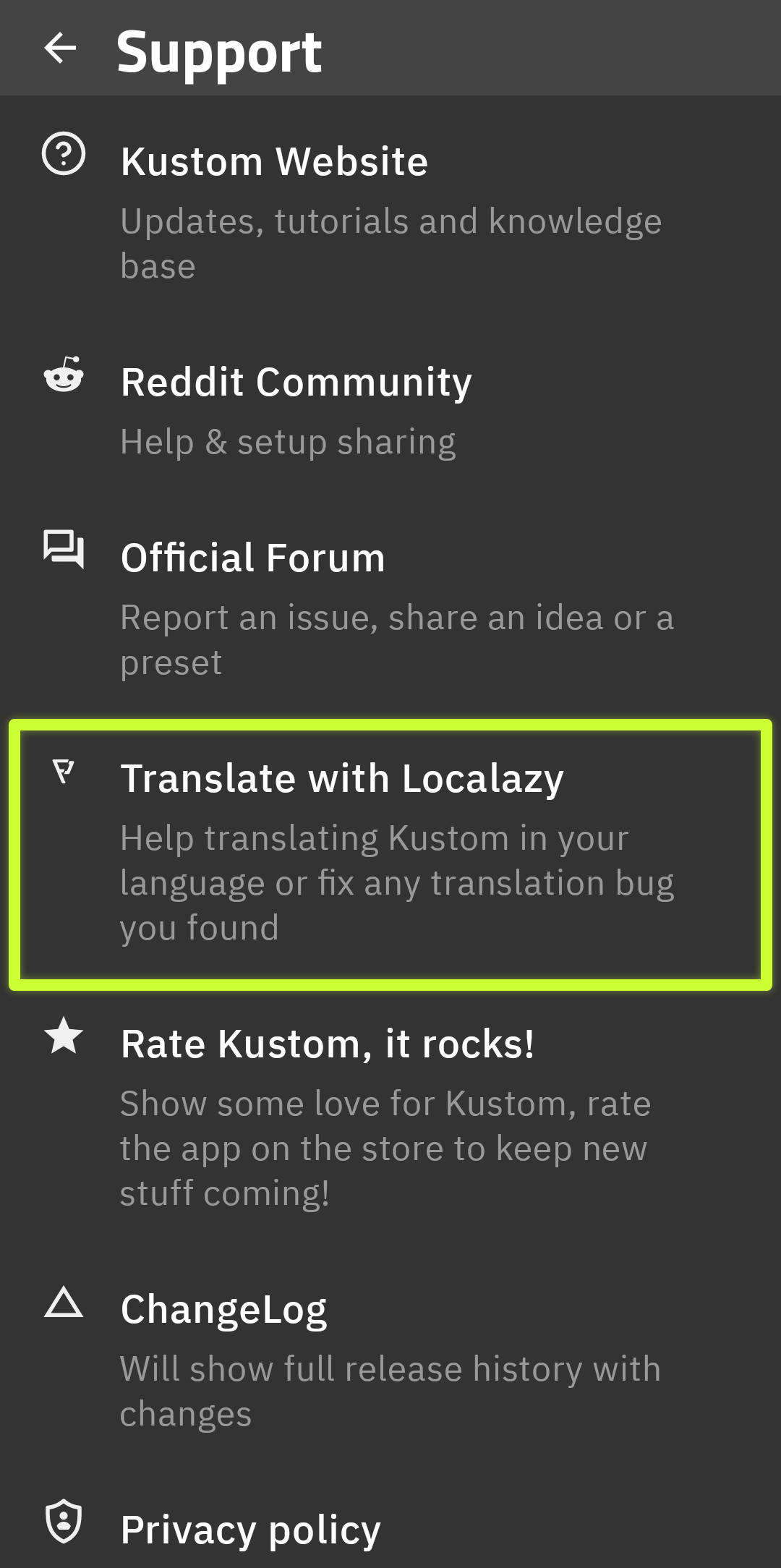 The localazy page (https://localazy.com/p/kustom) looks not works correctly.