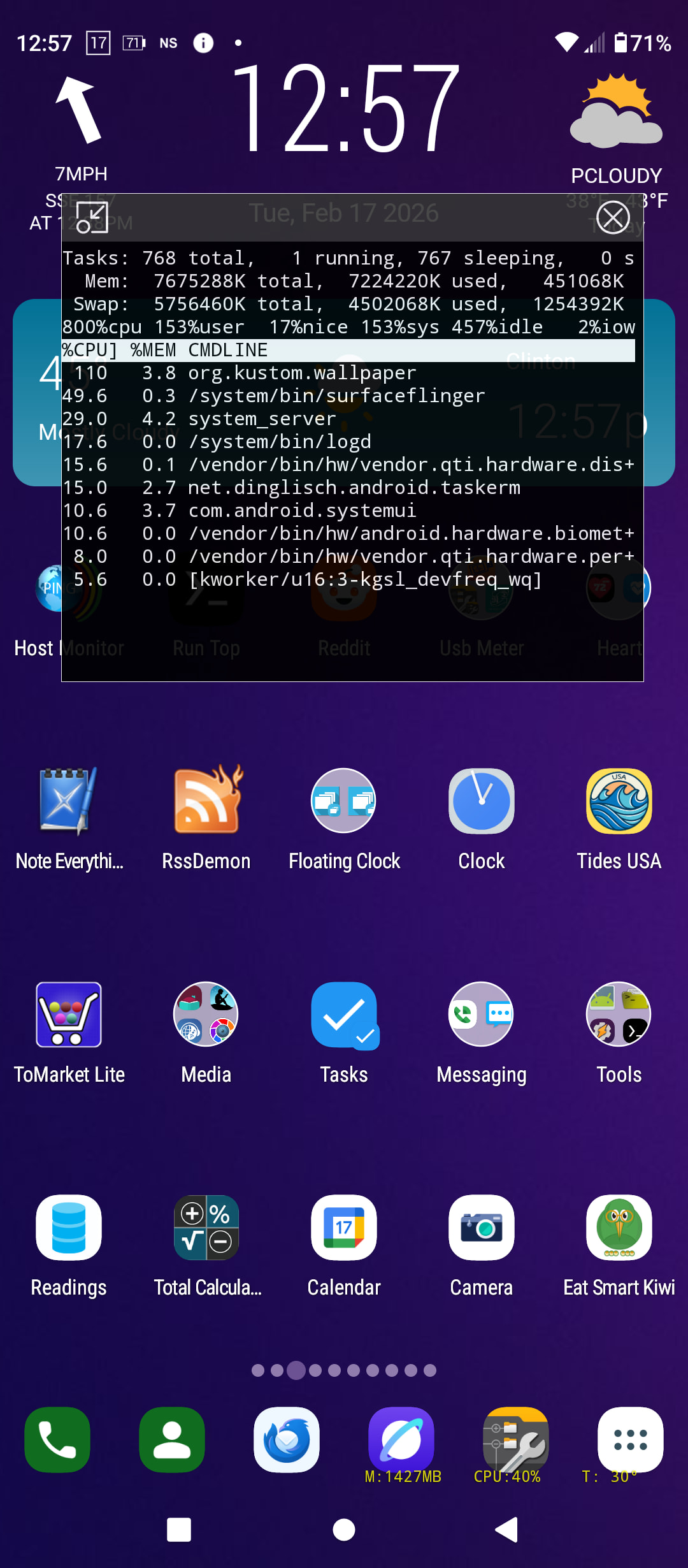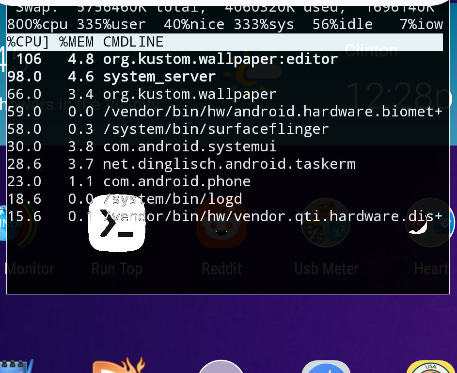 From the time I boot my phone until the time I actually start the editor, KLWP has no problems I can see. The “top” command shows it using 30-35% most of the time - perhaps a bit higher when it is running some flows.